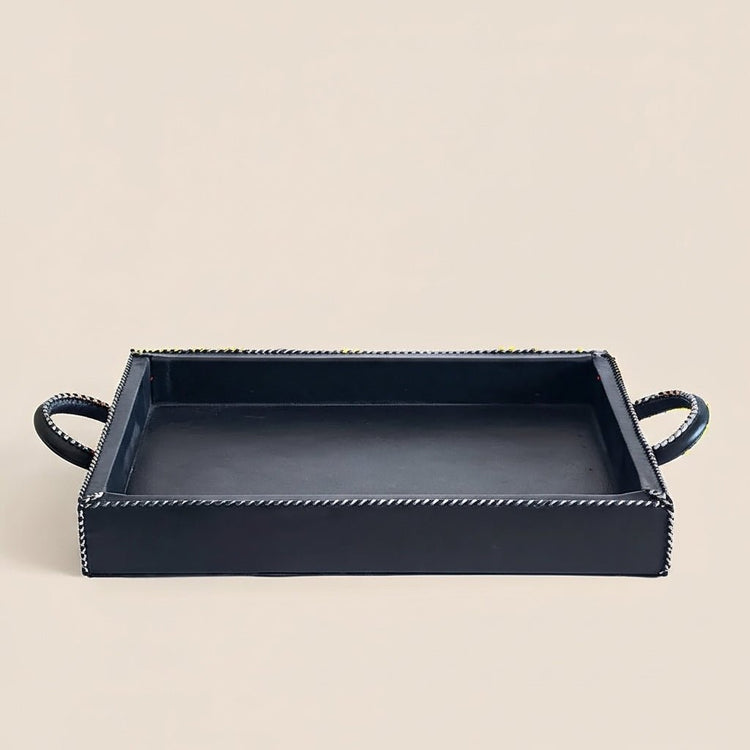 Revêtu de cuir avec élégance et agrémenté d'une couture à main, ce plateau en bois et cuir marie qualité supérieure, savoir-faire artisanal marocain et sophistication rustique. Il est fabriqué à partir de cuir de vachette de la plus haute qualité avec une couleur noir profond et une texture grainée. Le plateau est également doté d'un fond orné de punaises métalliques, ajoutant une touche d'originalité et de caractère à son design.