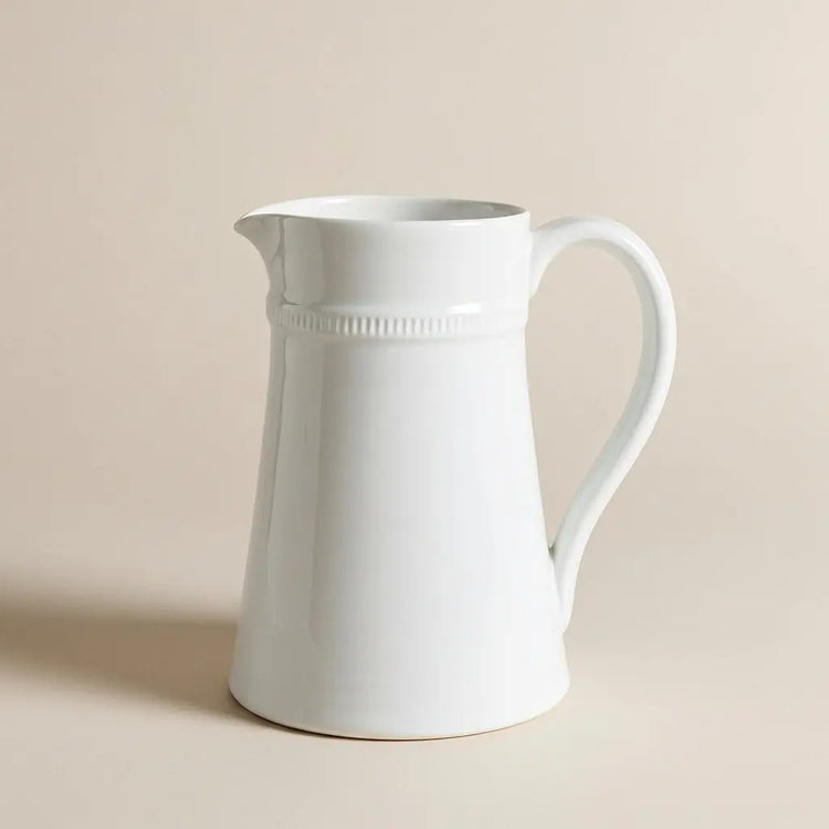 Ce pichet en céramique nervuré Tilha allie esthétisme et fonctionnalité avec son design raffiné. Sa silhouette élancée, légèrement évasée à la base et affinée vers le haut, offre une prise en main confortable et un bec verseur précis. Son motif nervuré au centre apporte une texture subtile qui capte la lumière et souligne son caractère artisanal. Idéal pour servir de l’eau, des infusions ou comme élément décoratif, ce pichet s’intègre parfaitement dans une décoration moderne et naturelle.